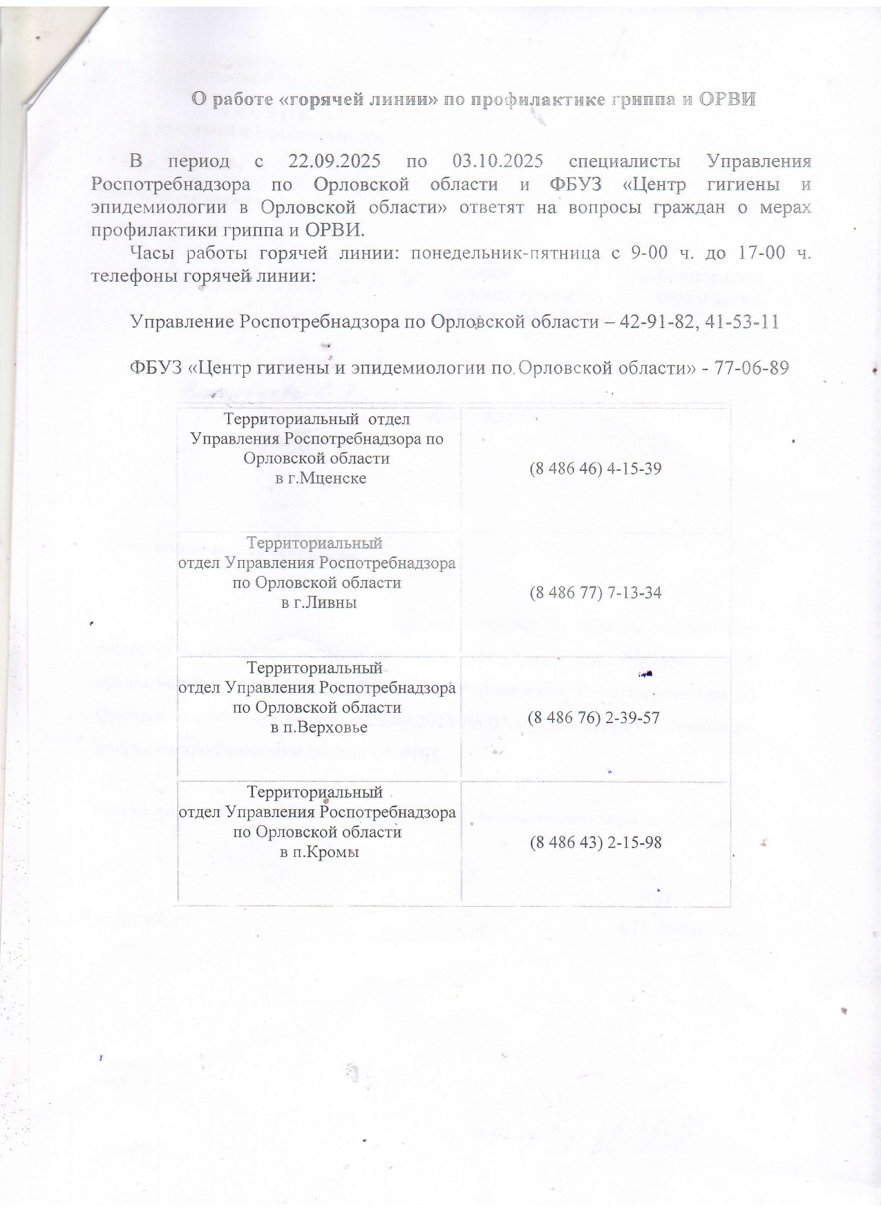 О работе "горячей линии" по профилактике гриппа и ОРВИ