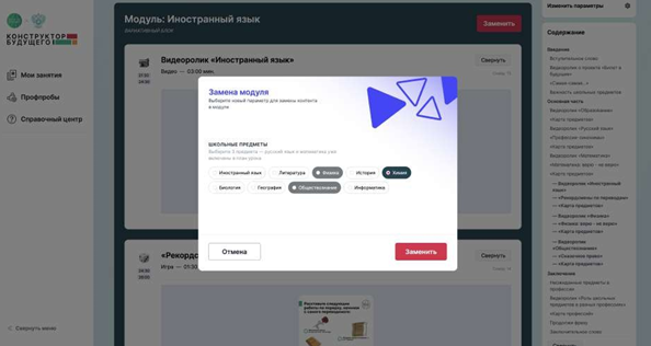 Доходим до модуля с кнопкой «Заменить». Вначале Инга захотела включить в занятие иностранный язык, но, изучив контент, подумала, что может отдельно использовать его в рамках своих уроков английского, а в профориентационном уроке лучше выбрать предметы, которые будут полезны, например, её ученикам из химико-биологического класса.